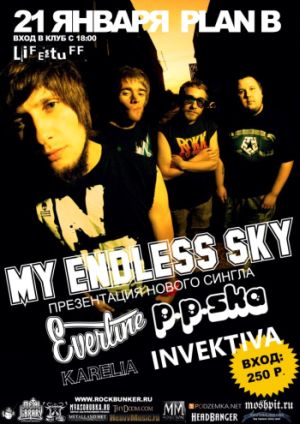 Концертное агентство Three Chords Music и клуб Plan B приглашают всех посетить уникальное мероприятие. Вполне обычный январский вечер может стать для вас чем-то особенным и запоминающимся. Повеселитесь от души вместе с эпатажным вокалистом группы My Endless Sky! Начало в 18.00.